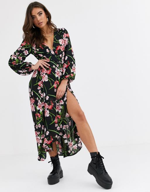 Missguided wrap midi dress with thigh split in floral print
